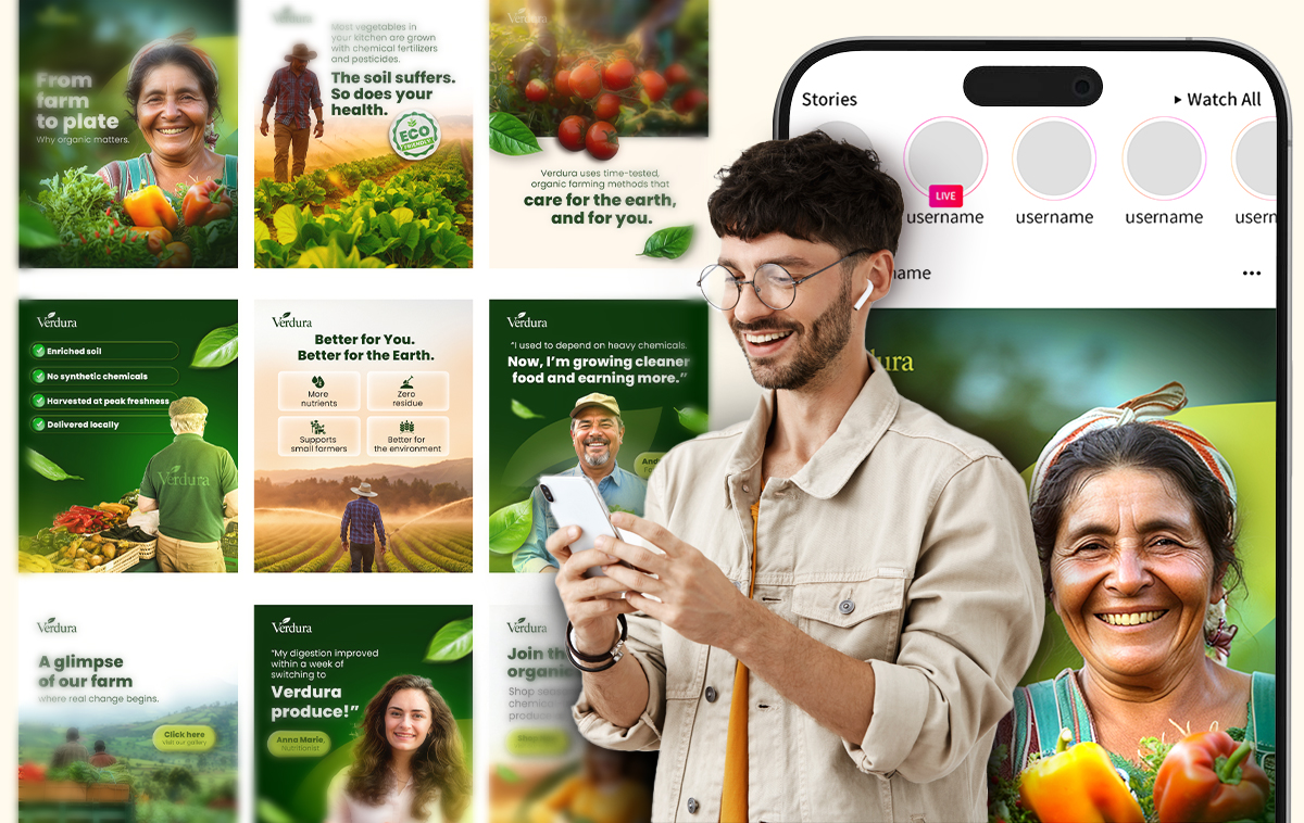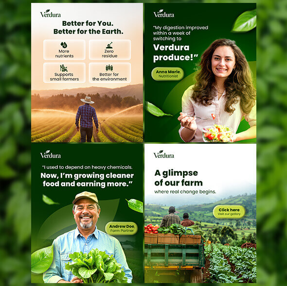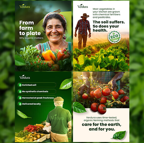 Every project begins with a deep dive into the content, focusing on understanding the message, the audience, and the brand tone. For Verdura, I started by reviewing all the available content to identify key themes and values. I then curated visual references and built a mood board to define the look and feel I wanted to achieve. Once the mood was set, I translated that direction into original visuals, ensuring every element, from color to layout, carried the same freshness and clarity that the brand stands for.